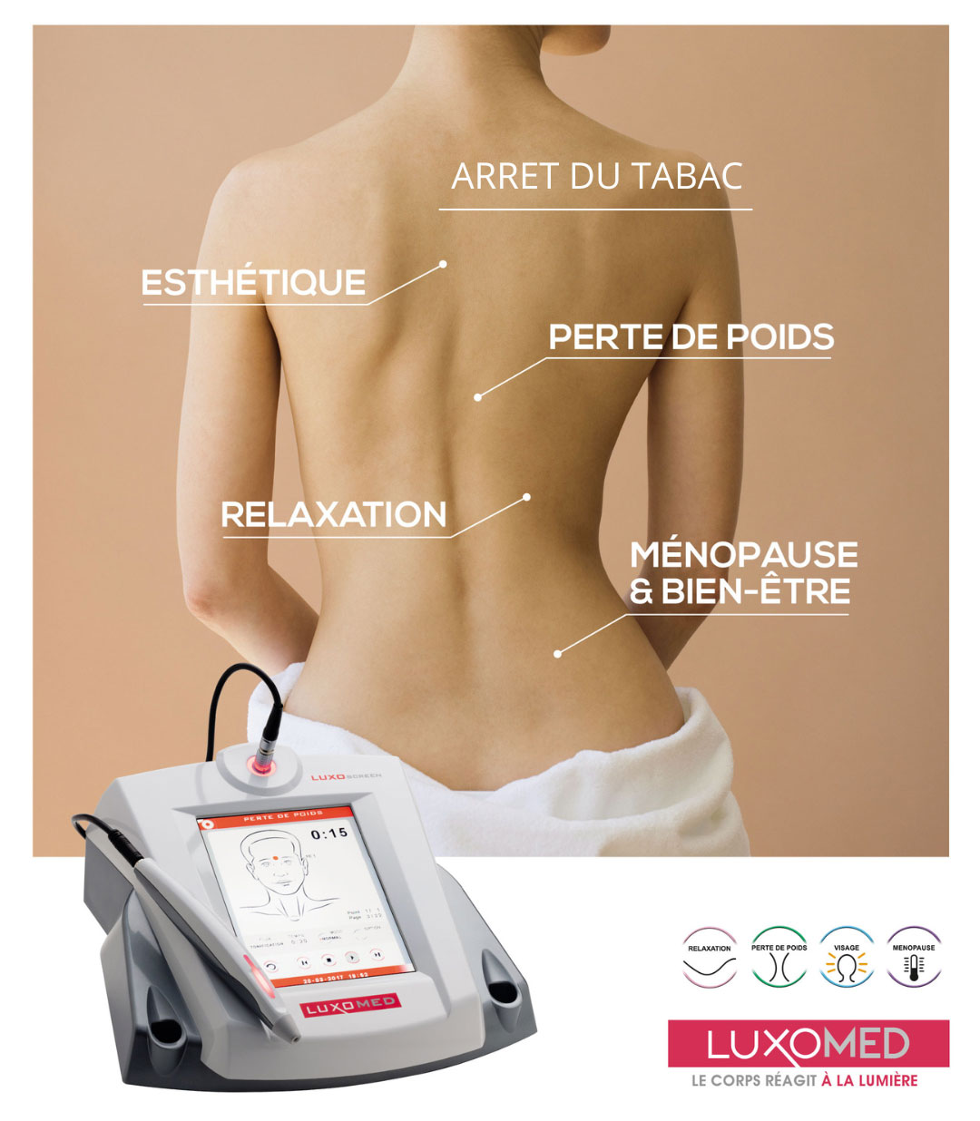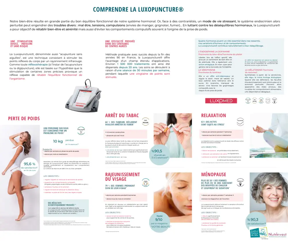 La Luxopuncture®, également connue sous le nom d'« acupuncture sans aiguilles », est une méthode innovante de stimulation douce, indolore et sans risque, qui vise à rétablir le bien-être et la sérénité en rééquilibrant le système hormonal. Cette technique repose sur la stimulation des points réflexes du corps à l'aide d'un rayonnement infrarouge, similaire à d'autres formes de réflexothérapie comme l'acupuncture ou la digipuncture. Elle est particulièrement efficace pour lutter contre les déséquilibres hormonaux responsables de nombreux troubles tels que le mal-être, les tensions, et les comportements compulsifs (comme les envies de manger, grignoter, ou fumer).